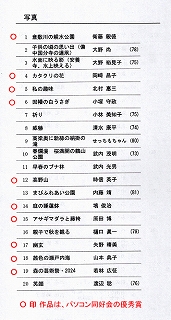 今回の第6回写真展にエントリーしてくださったのは14名の方々でした。 有難うございました。次回も参加者が増えますように!!。 優秀賞出展者には、賞状・記念賞品が出ますし、他の参加者には、記念品が出ます。 参加しないと何も有りません。 |
