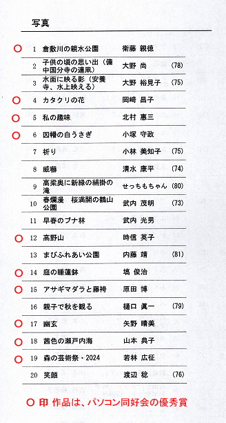 倉敷パソコン同好会 第六回写真展 2025年1月~4月 写真募集 5月 投票・集計 展示場所 倉敷市福田町 浦田憩の家 |