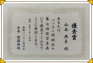 | 今回の第七回写真展にエントリーしてくださったのは17名の方々でした。 有難うございました。エントリーされる方が増えました。 次回も参加者が増えますように!!。 優秀賞の 出展者には、賞状・記念賞品が出ますし、他の参加者には、記念品が出ます。 |